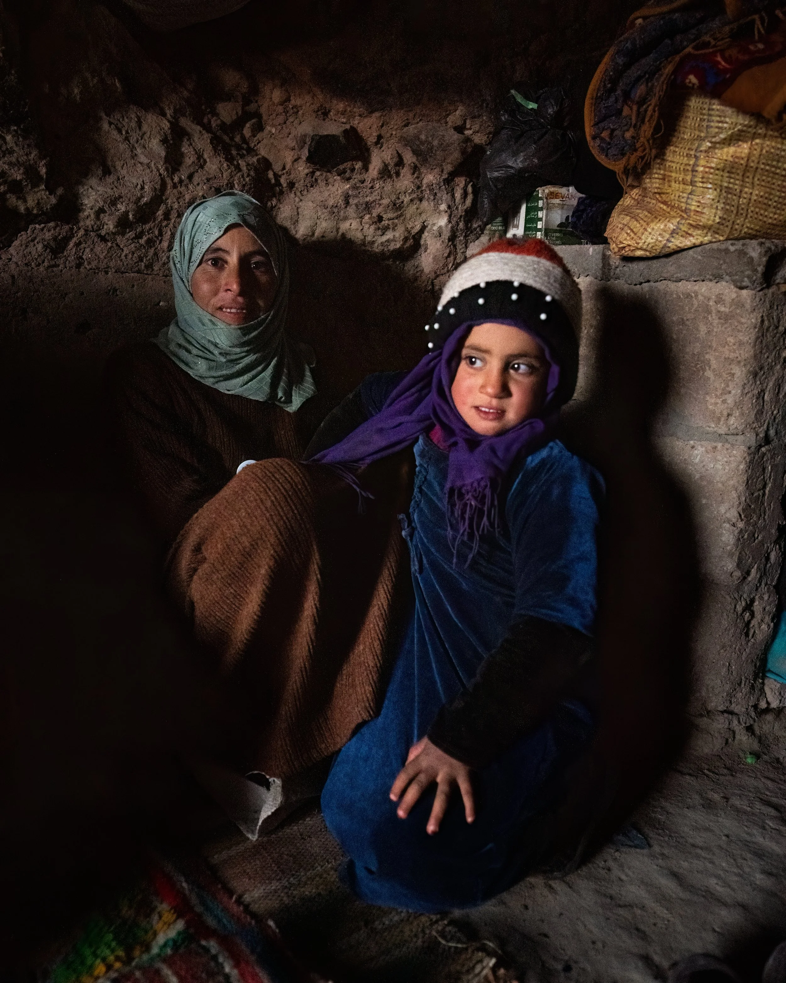 Tucked into the back of the cave, a grandmother and her granddaughter sit in quiet stillness—wrapped in deep indigo and wool. The child leans into her elder’s side as light from the entrance brushes across their faces, illuminating a moment of generational closeness and calm.